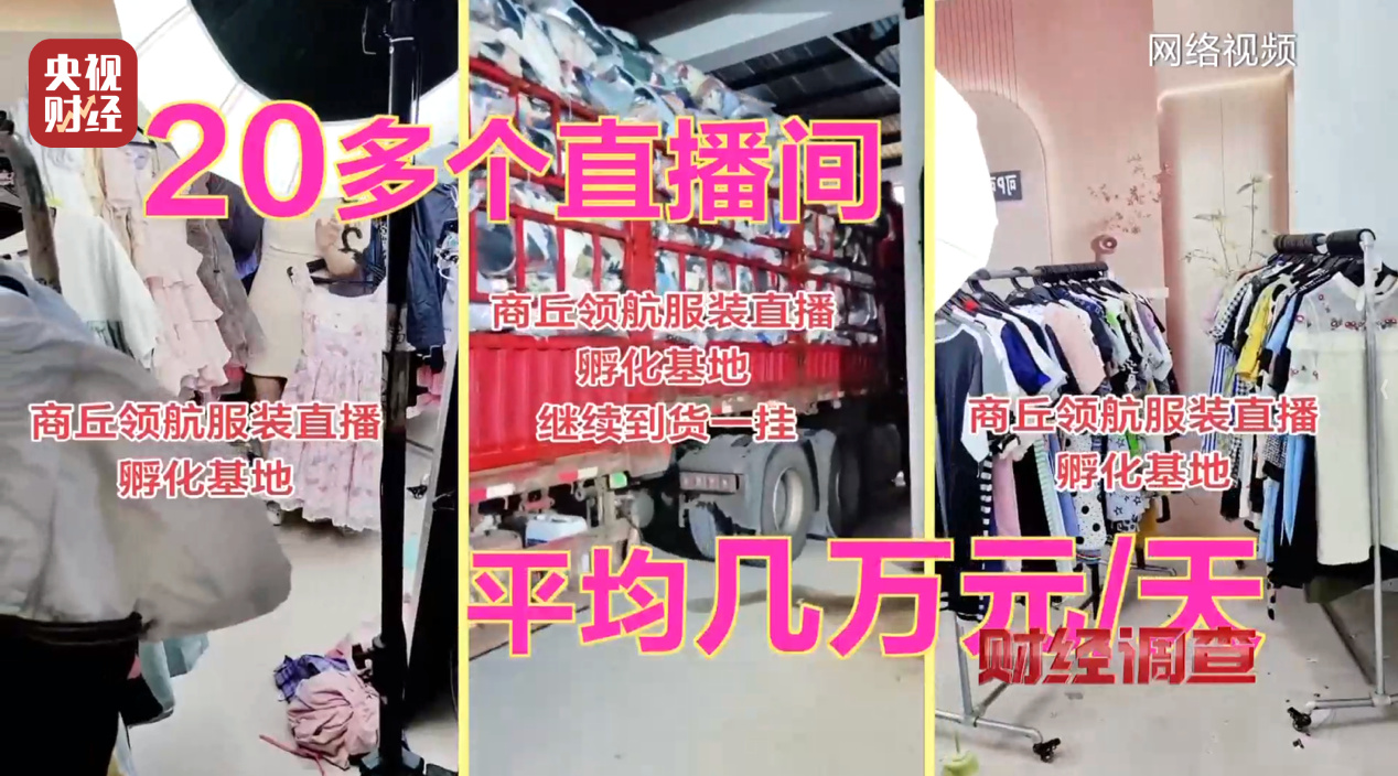 天和服饰老板告知记者,河南商丘直播基地是其最大客户,记者循线索前往调查。进入商丘领航直播基地,发现整层楼是大型二手衣物仓库,衣架挂满各式二手服装,角落堆着装满衣服的麻袋。